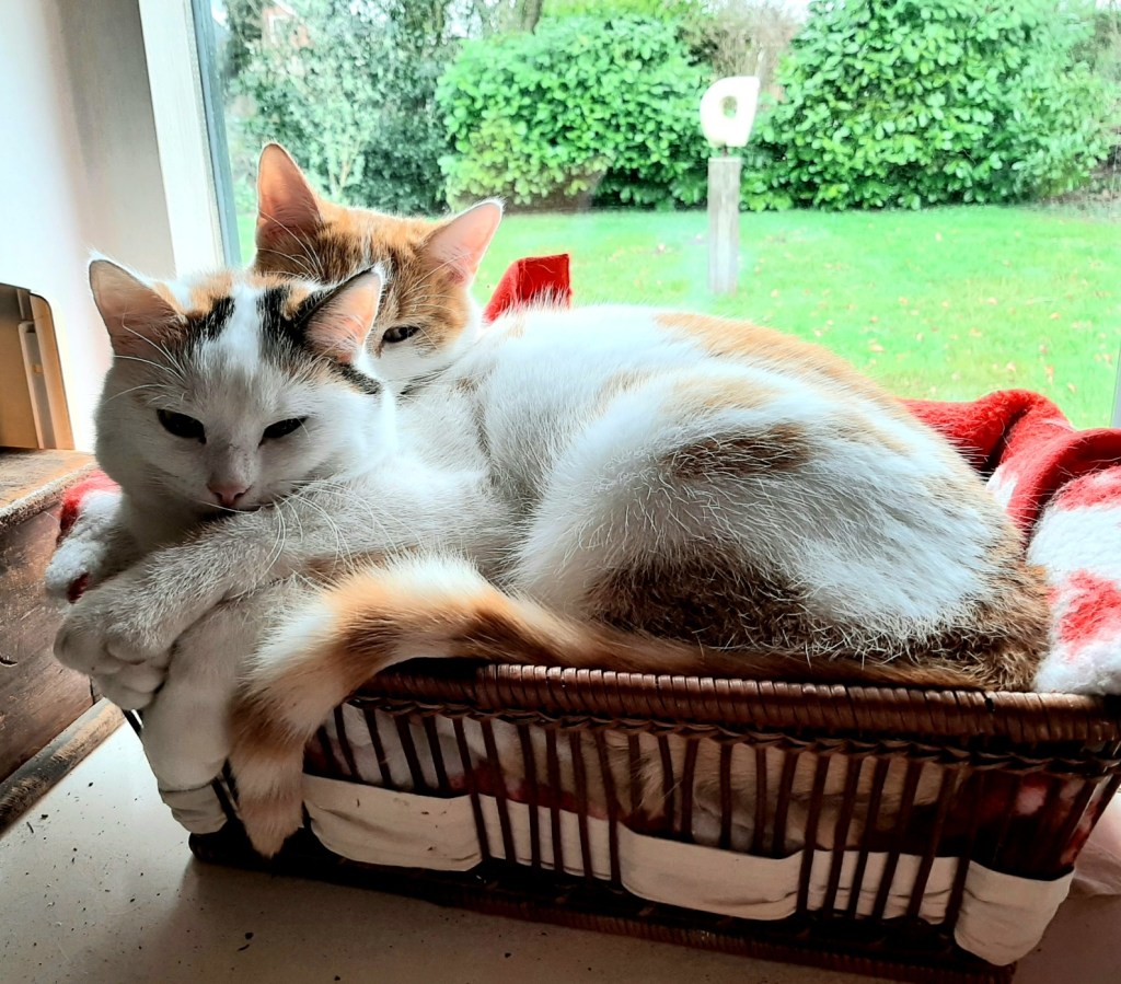 Maar vandaag niet, want Teun is pardoes bovenop haar geploft met zijn grote lijf, zijn poot en staart stevig om haar nekje geklemd. Roos kan geen kant op. ‘Moet dat nou’ zie je haar denken, ‘kan hij niet ergens anders gaan liggen?’