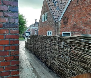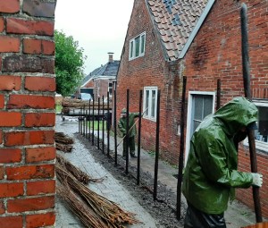 Glibberend liepen ze heen en weer tussen hun aanhangwagen, volgeladen met wilgentenen, en de palen. Terwijl voormalig orkaan Humberto zich nog een keer goed kwaad maakte vlochten de mannen de tenen langs de palen. In rap tempo lieten de drijfnatte en daardoor soepele tenen zich plooien tot een wilgentenen-schutting.