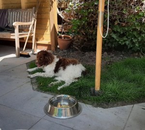 Daar ligt ze nu prinsesheerlijk op het koele gras met de waterbak onder pootbereik. Dat de baasjes nu volop in de zon zitten te puffen zal haar een zorg zijn. Hadden ze maar niet moeten verhuizen.