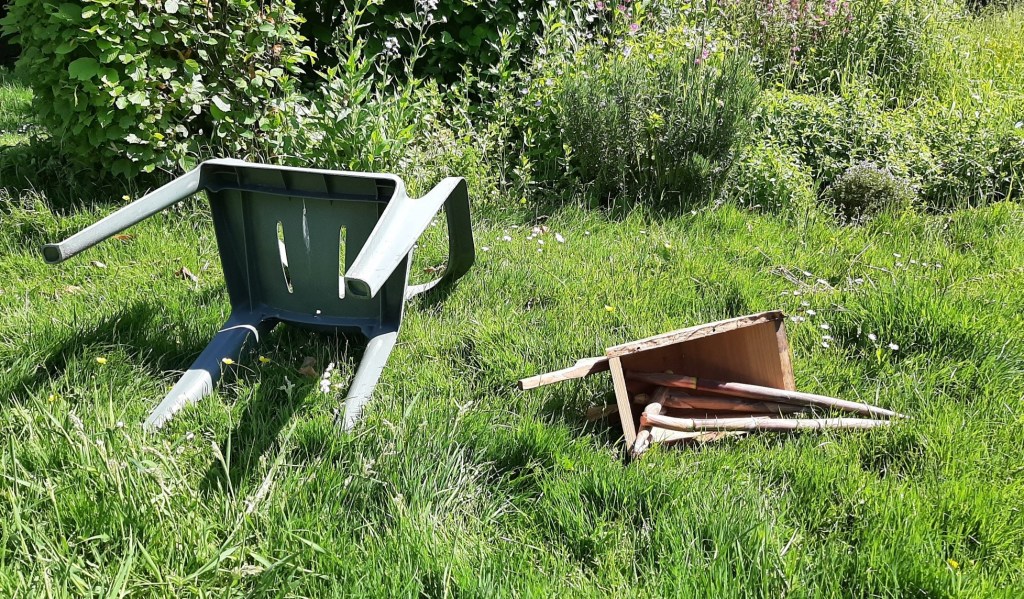 Aan het einde van de dag schuilen we onder de kastanjeboom. We raken aan de praat. Terwijl de regen valt en de schemering inzet vergeten we de wereld om ons heen. We merken niet dat het kouder wordt en vergeten hoe moe we zijn. Na een uur staan we er nog. De tuin is klaar, wij nog lang niet.